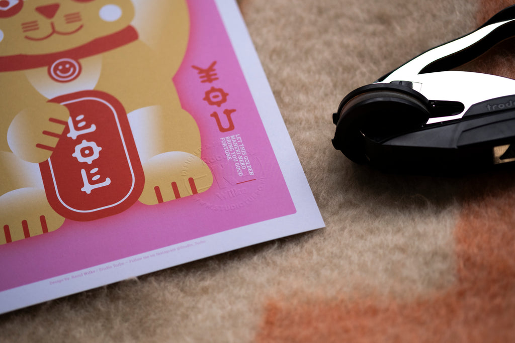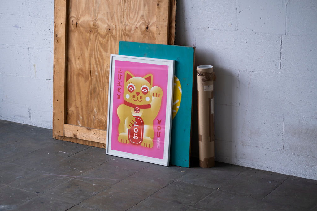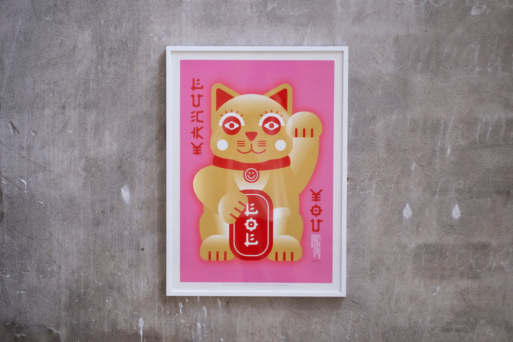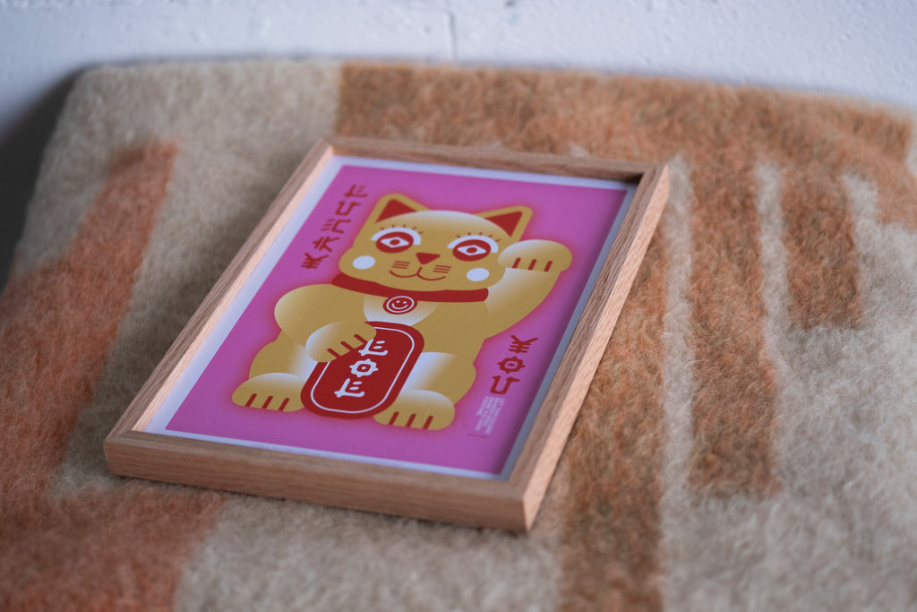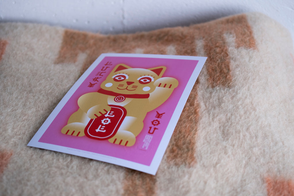 My take on a Maneki Neko; the Japanese lucky cat. This brightly coloured print will add a big splash of pink (and luck) to your wall.